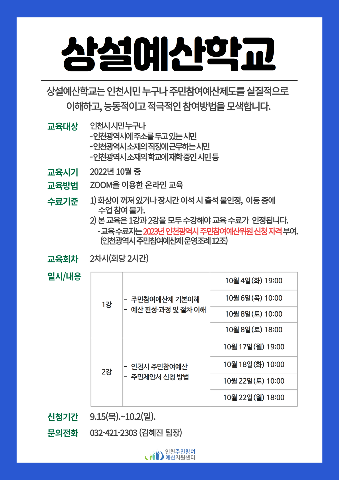 인천시 주민참여예산 상설 예산학교 교육 안내