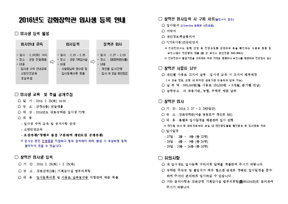 2016년 강화장학관 입사생 등록안내 및 공지사항