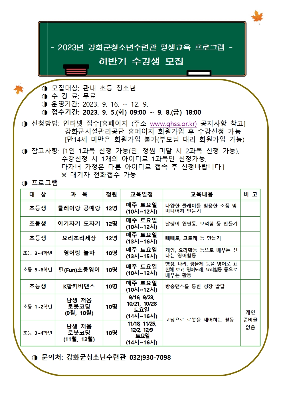 강화군청소년수련관 하반기 평생교육 프로그램 참가자 모집 안내