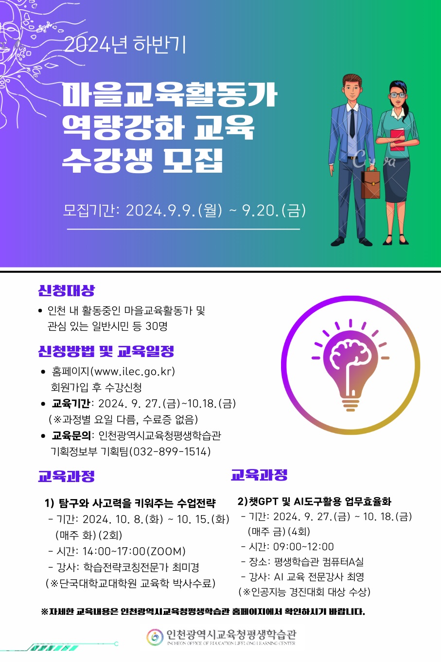 인천광역시교육청평생학습관 2024년 하반기 마을교육활동가 역량강화 교육 학습자 모집