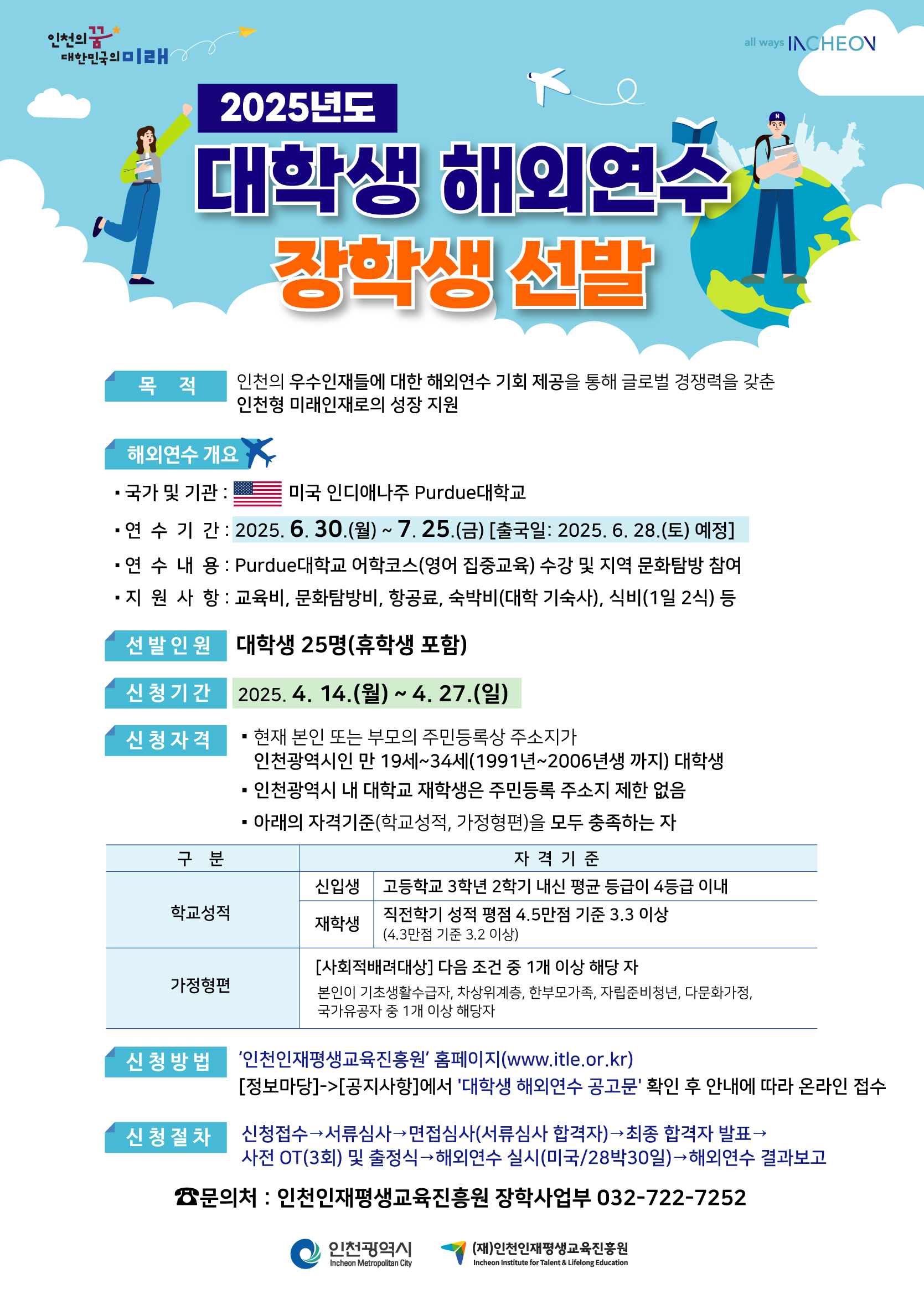 2025년도 (재)인천인재평생교육진흥원 대학생 해외연수 장학생 선발 안내