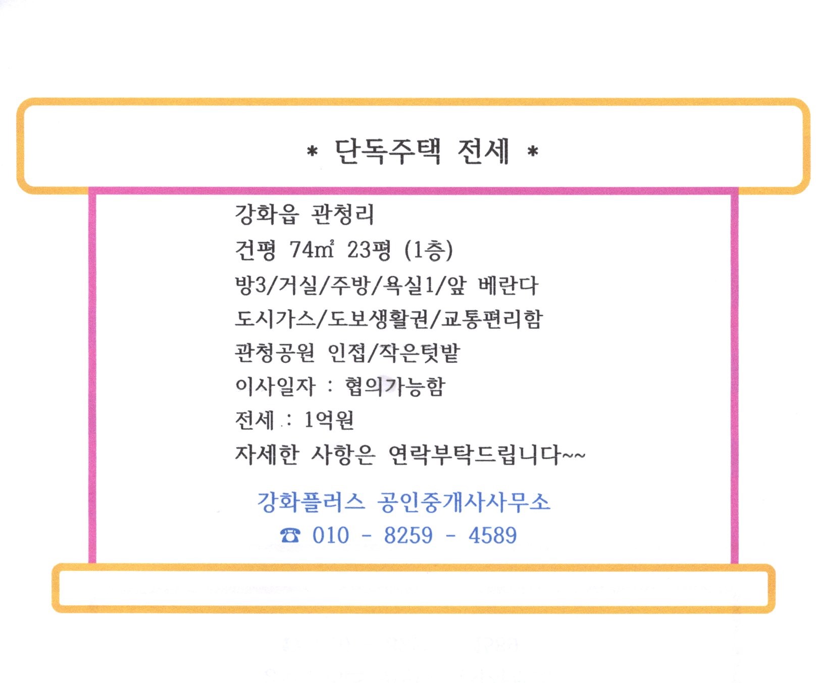 *단독주택 1층 전세(강화읍 관청리/작은텃밭/도시가스)1억원*