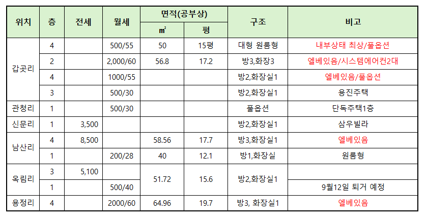 • 위 사항에 맞지 않을 경우, 통보 없이 임의 삭제 될 수 있습니다. 본 게시판은 중개업소 및 주민 자율참여 정보란으로 관련법 위반 예외로 발생한 문제에 대해서는 군청에서 책임지지 않으니 이용에 참고하시기 바랍니다.