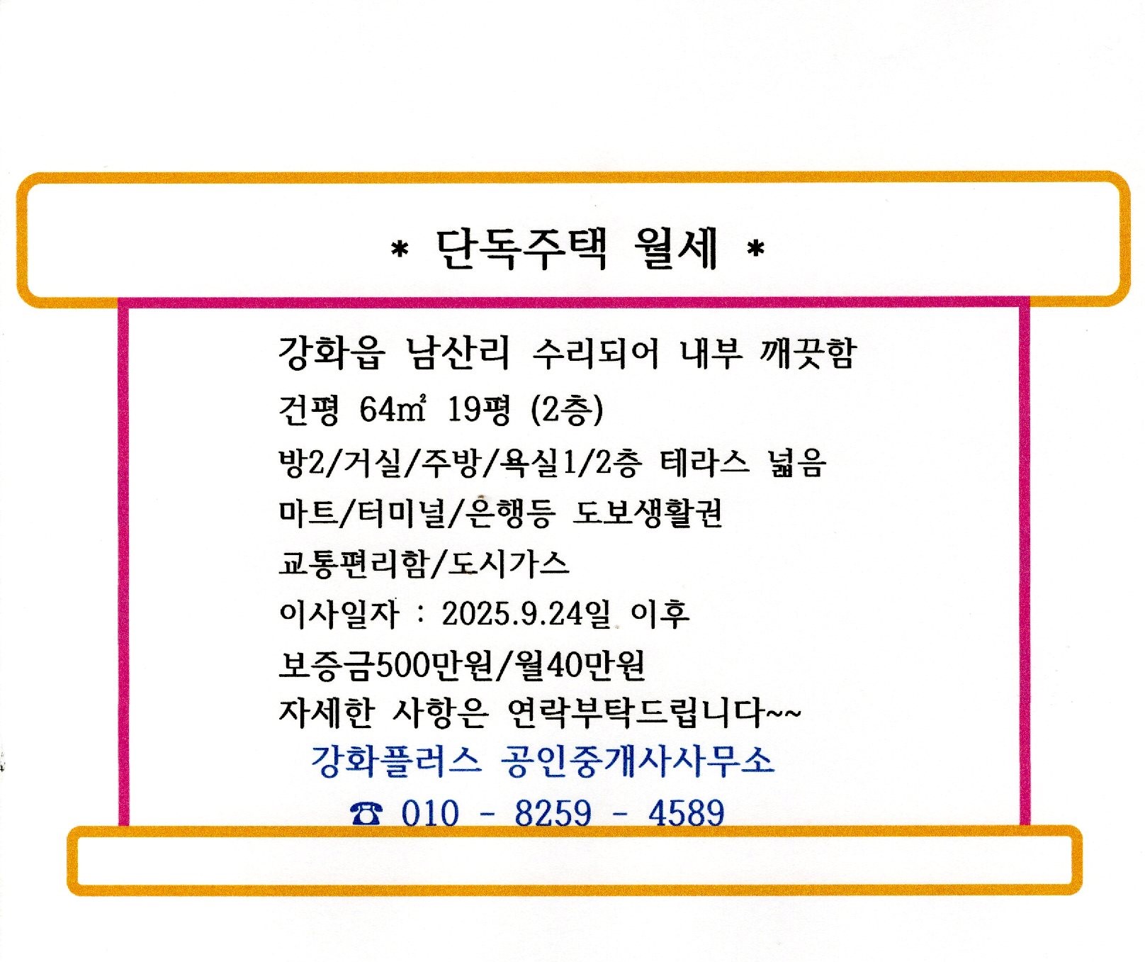 *도보생활권 단독주택 2층 월세(넓은테라스/도시가스/강화읍 남산리)*