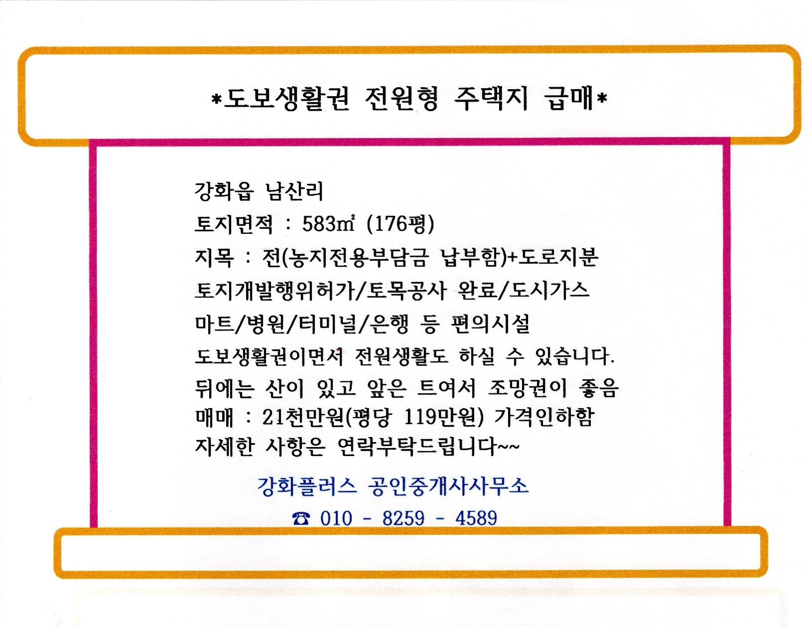 *도보생활권 전원형 주택지 급매(도시가스/강화읍 남산리)*