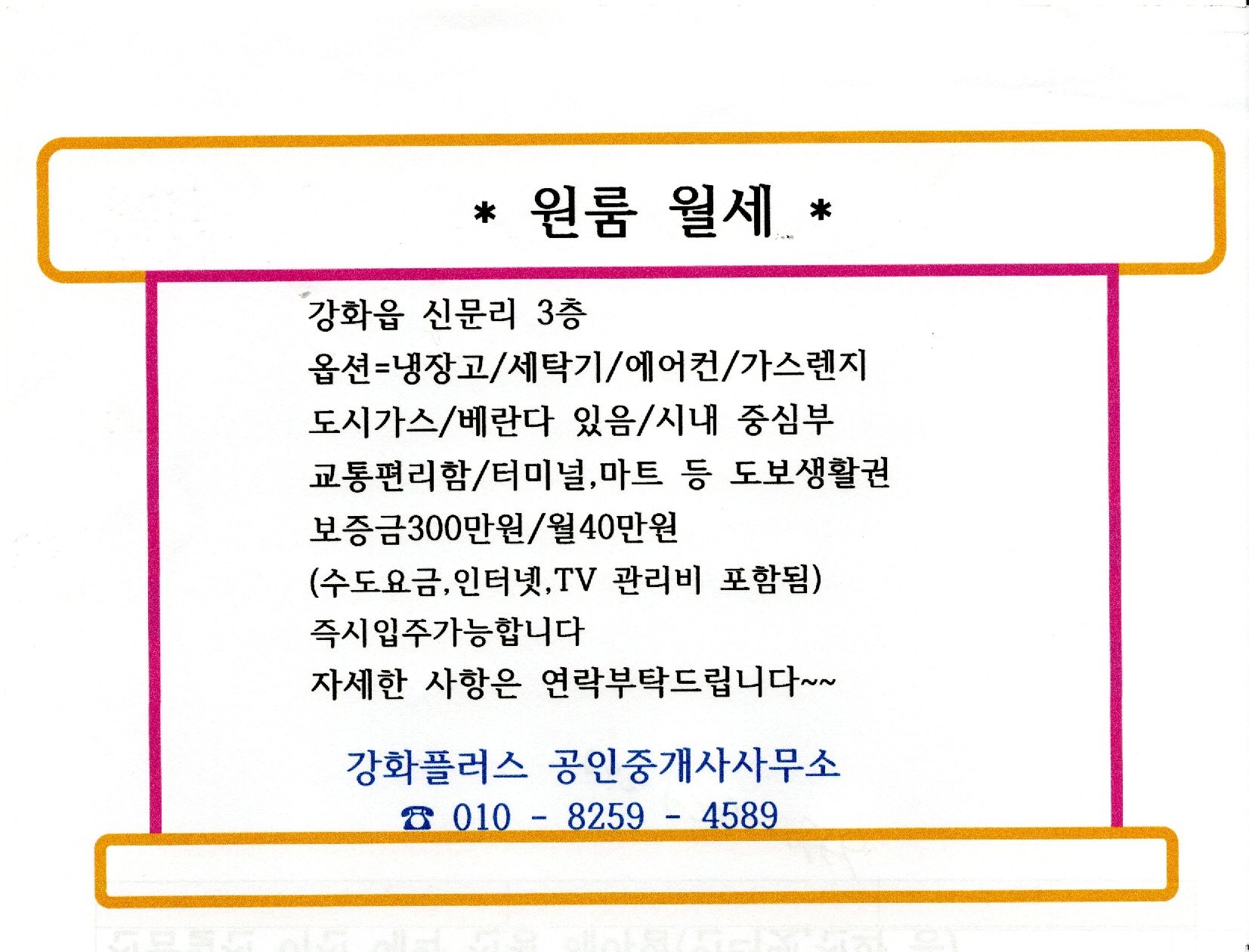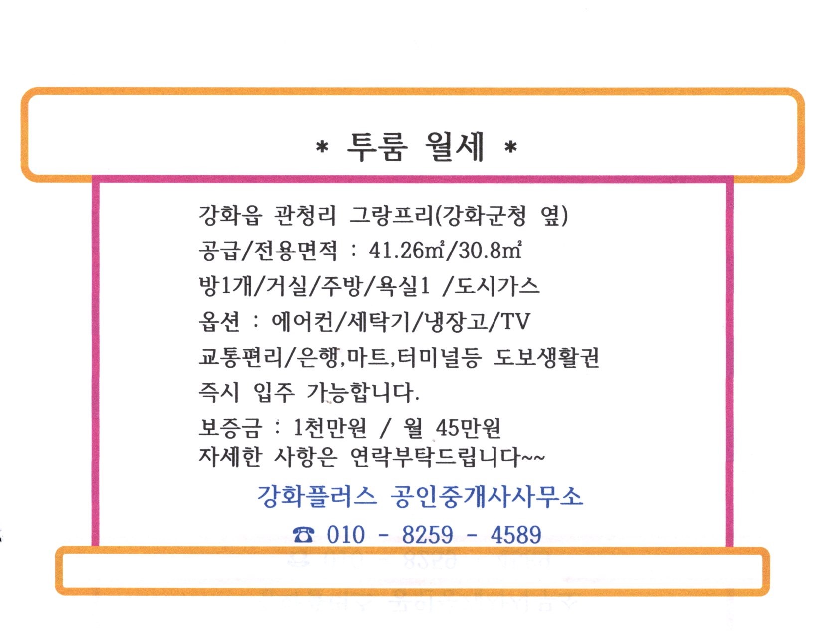 *그랑프리 투룸 월세 (보증금1천만원/월45만원/강화읍 관청리/ 강화군청옆/즉시입주가능)/원룸 월세(강화읍 신문리)**