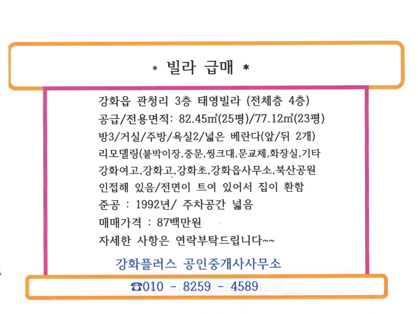 *리모델링한 빌라 급매 87백만원(강화읍 관청리/숲세권/남향 3층/앞 뒤 베란다 넓음)*