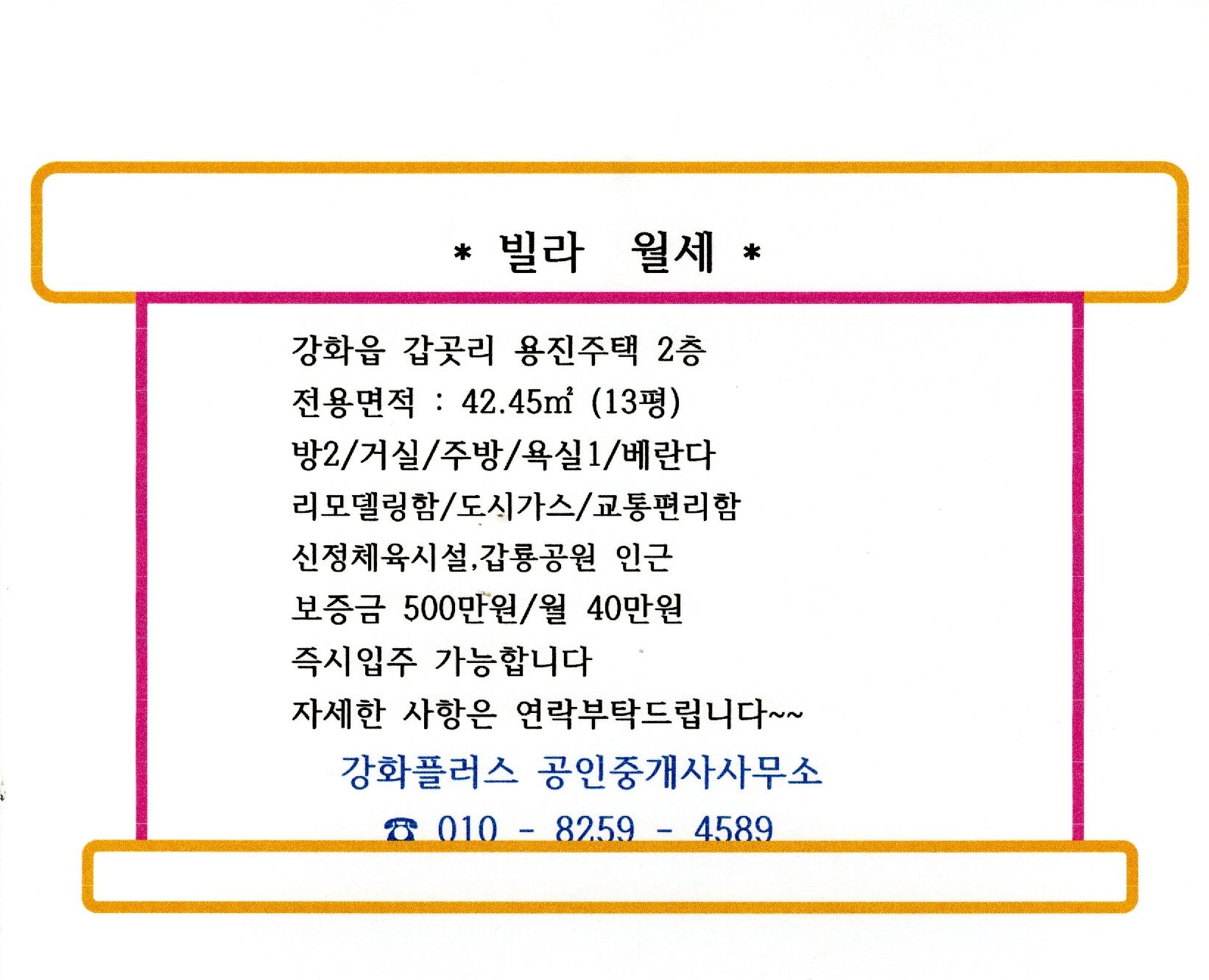 *빌라 2층 월세 보증금500만원/월40만원(리모델링/강화읍 갑곳리/도시가스/즉시입주가능)*