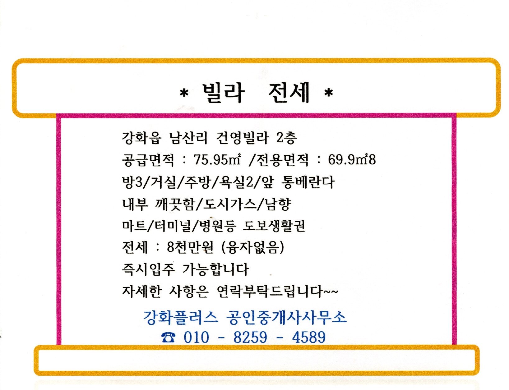 *강화읍 남산리 건영빌라 2층 전세 8천만원(비에스병원 인근)*
