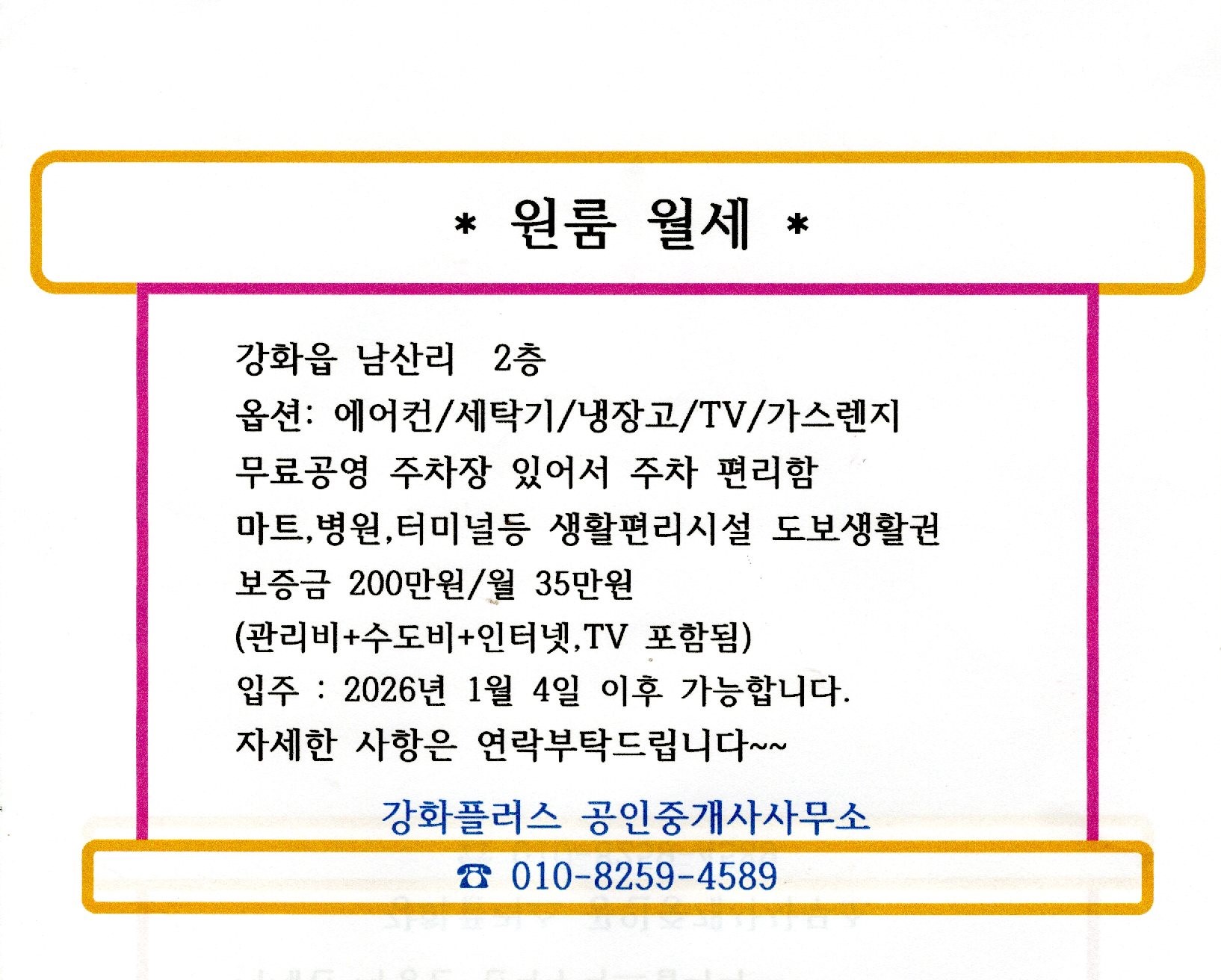 *원룸 월세(보증금200만원/월35만원(수도+관리비 +인터넷+TV포함/강화읍 남산리)*
