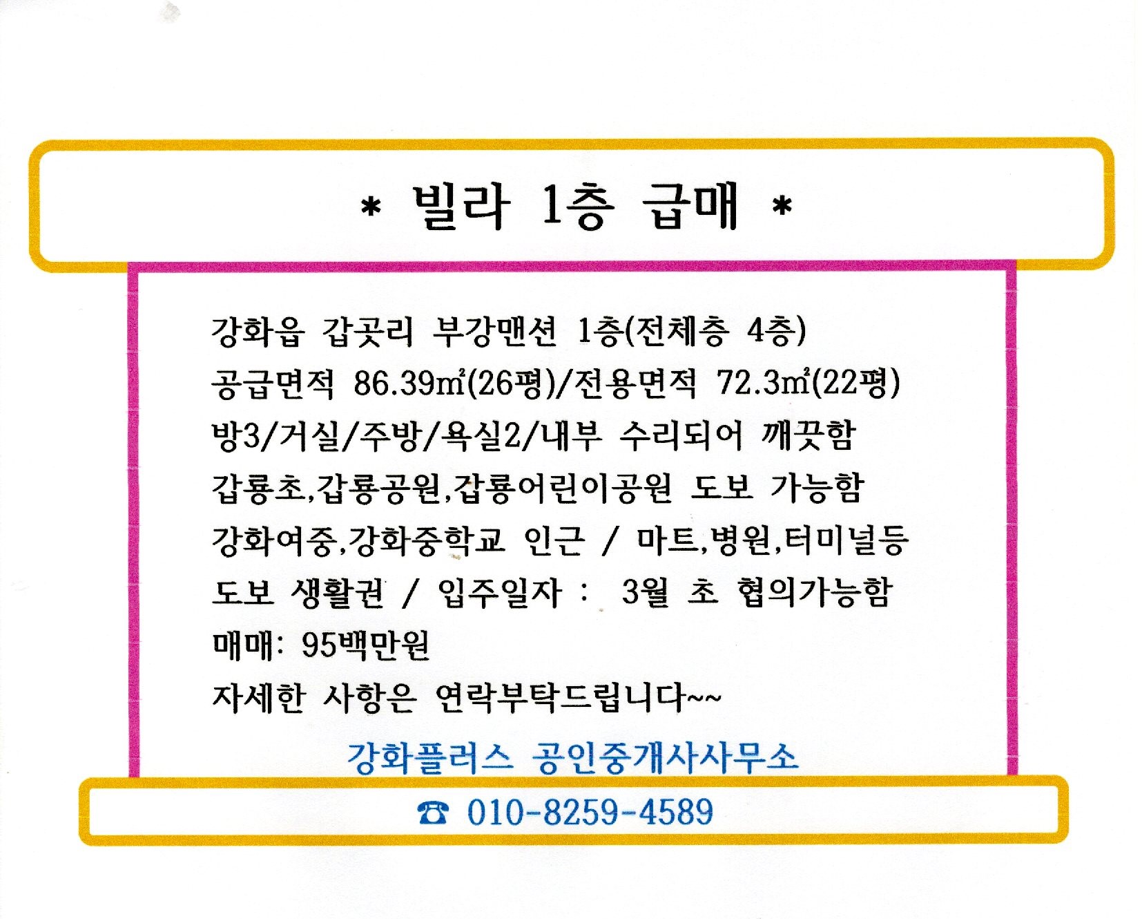 *갑룡초 인근 1층 빌라 급매(강화읍 갑곳리/부강그린맨션/내부 깨끗함)*