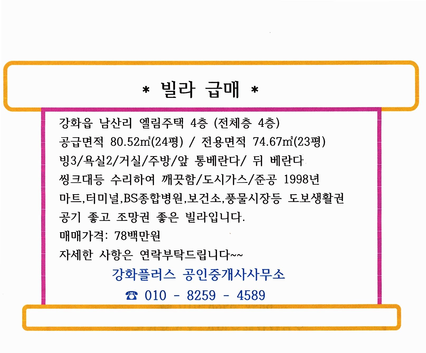 *조망권 좋은 도보생활권 빌라 급매 78백만원(강화읍 남산리/4층/주차장넓음/대지지분33평)*
