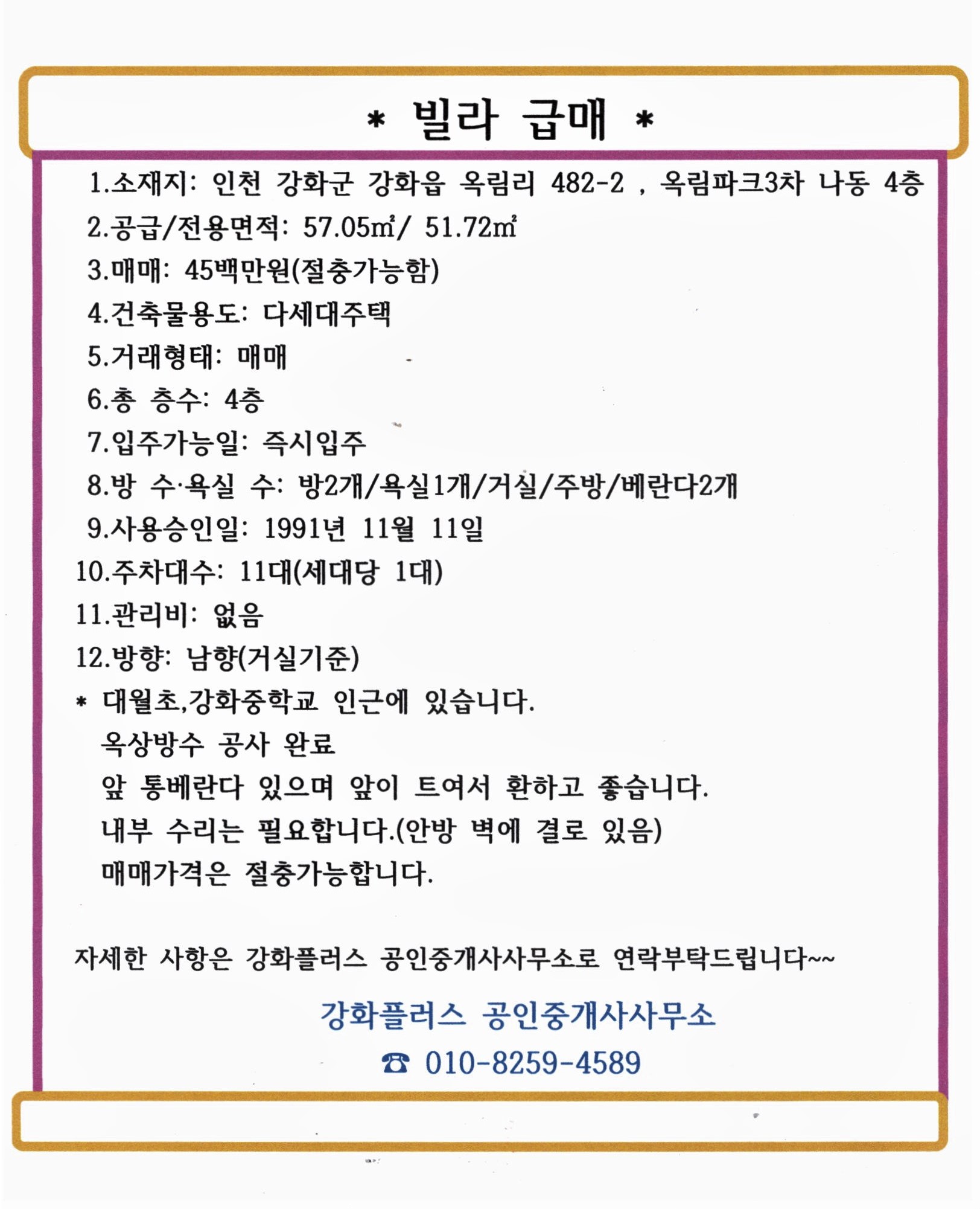 * 빌라 급매 45백만원(가격절충가능/강화읍 옥림리 4층)*