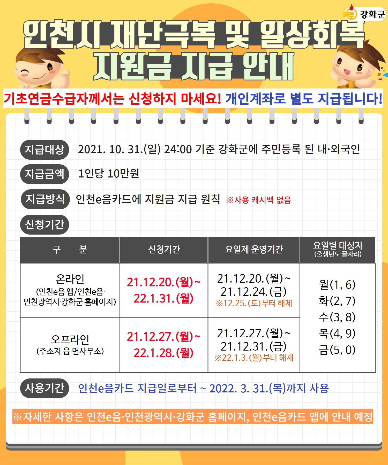 인천시 재난극복 및 일상회복 지원금 지급 안내