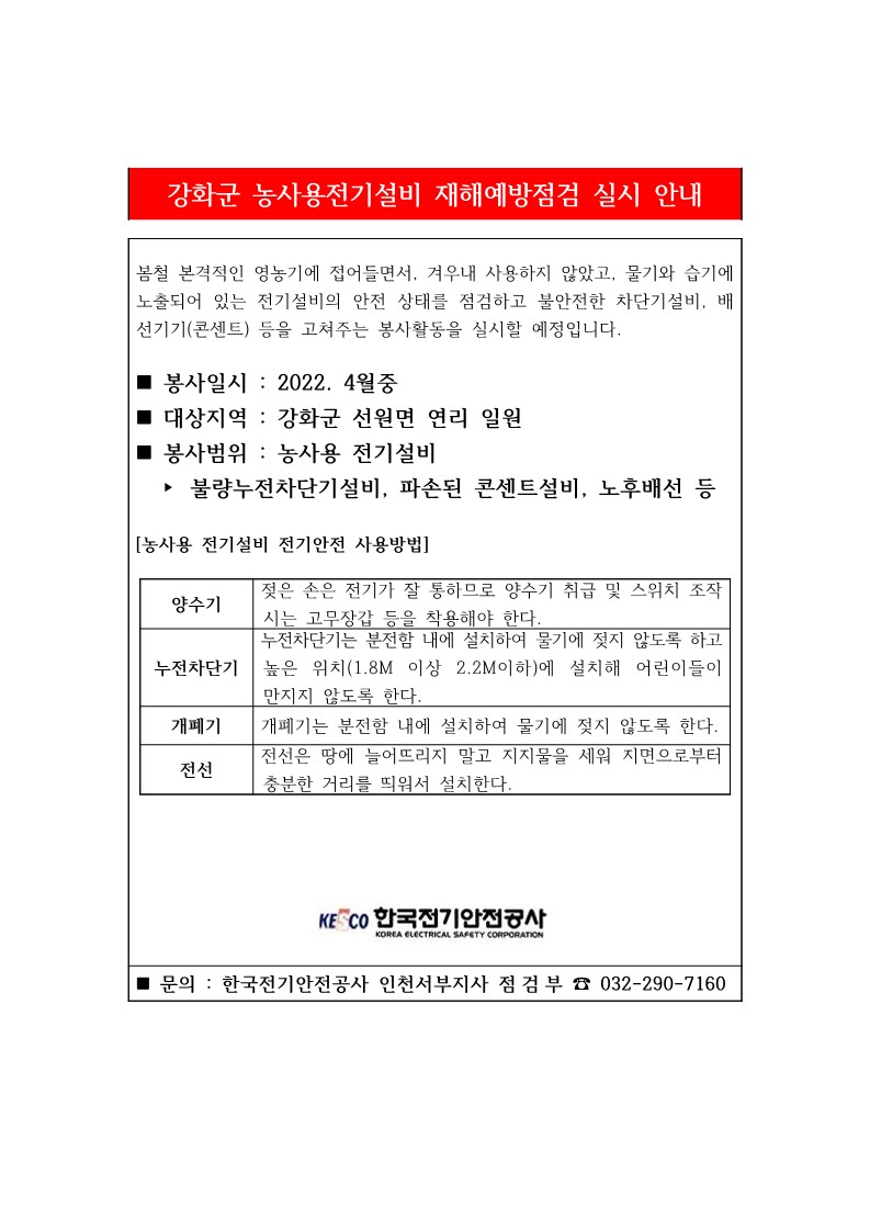 강화군 농사용전기설비 재해예방점검 실시 안내