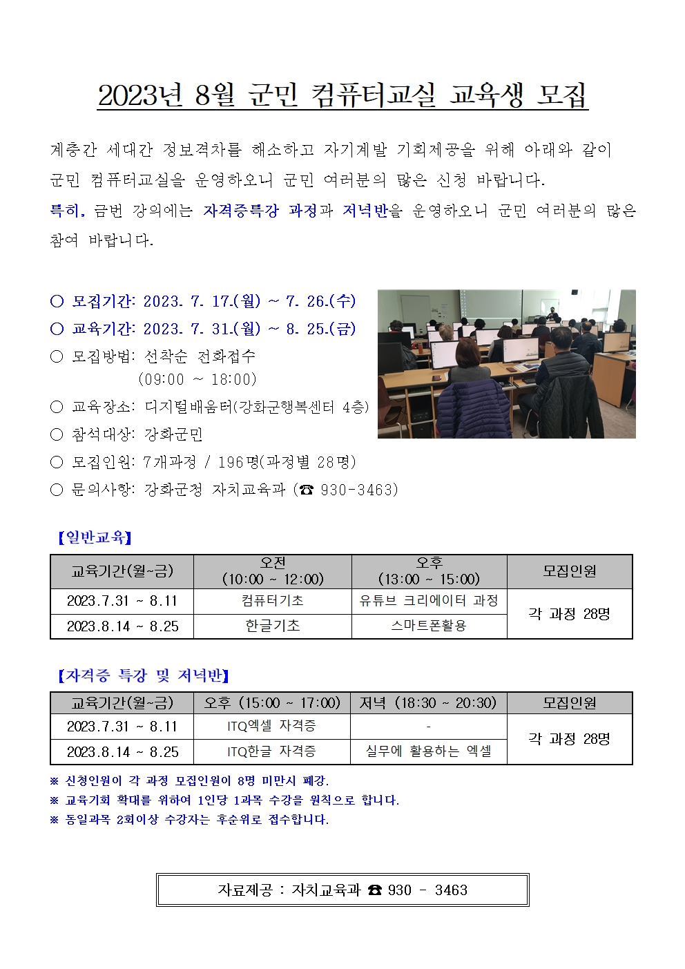 2023년 8월 군민컴퓨터 교실 모집 안내