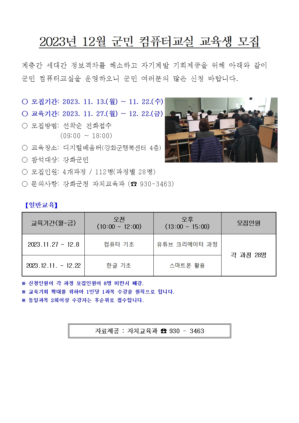 2023년 12월 군민컴퓨터 교실 모집 안내