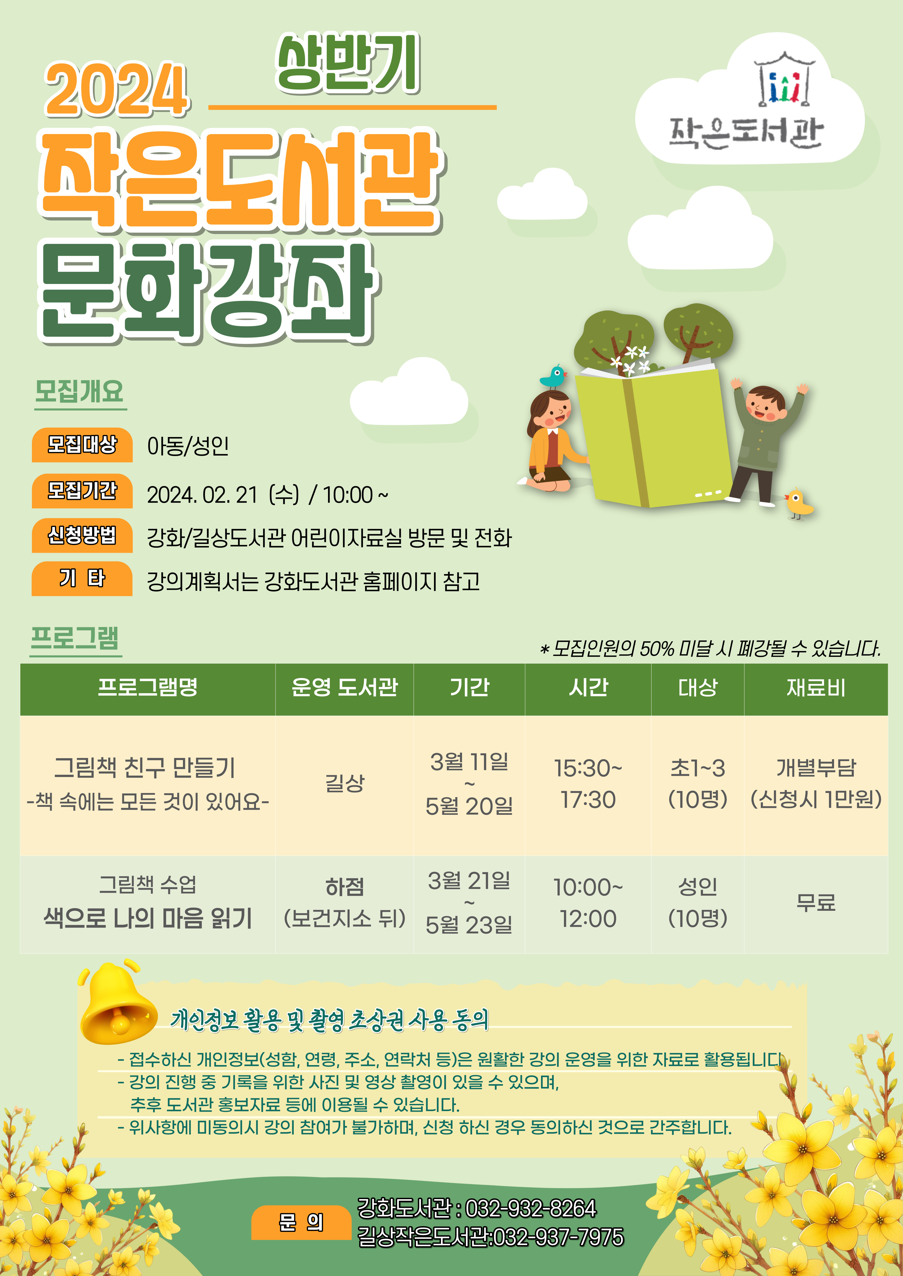 강화군 도서관에서는 2024년 상반기 문화프로그램 수강생을 모집하고 있습니다.
