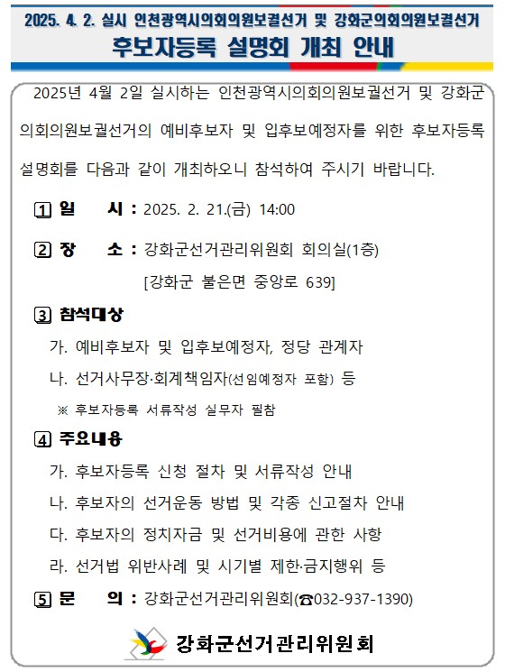 2025.4.2.실시 인천시의회의원보궐 및 강화군의회의원보궐 선거 후보자등록 설명회 개최 안내