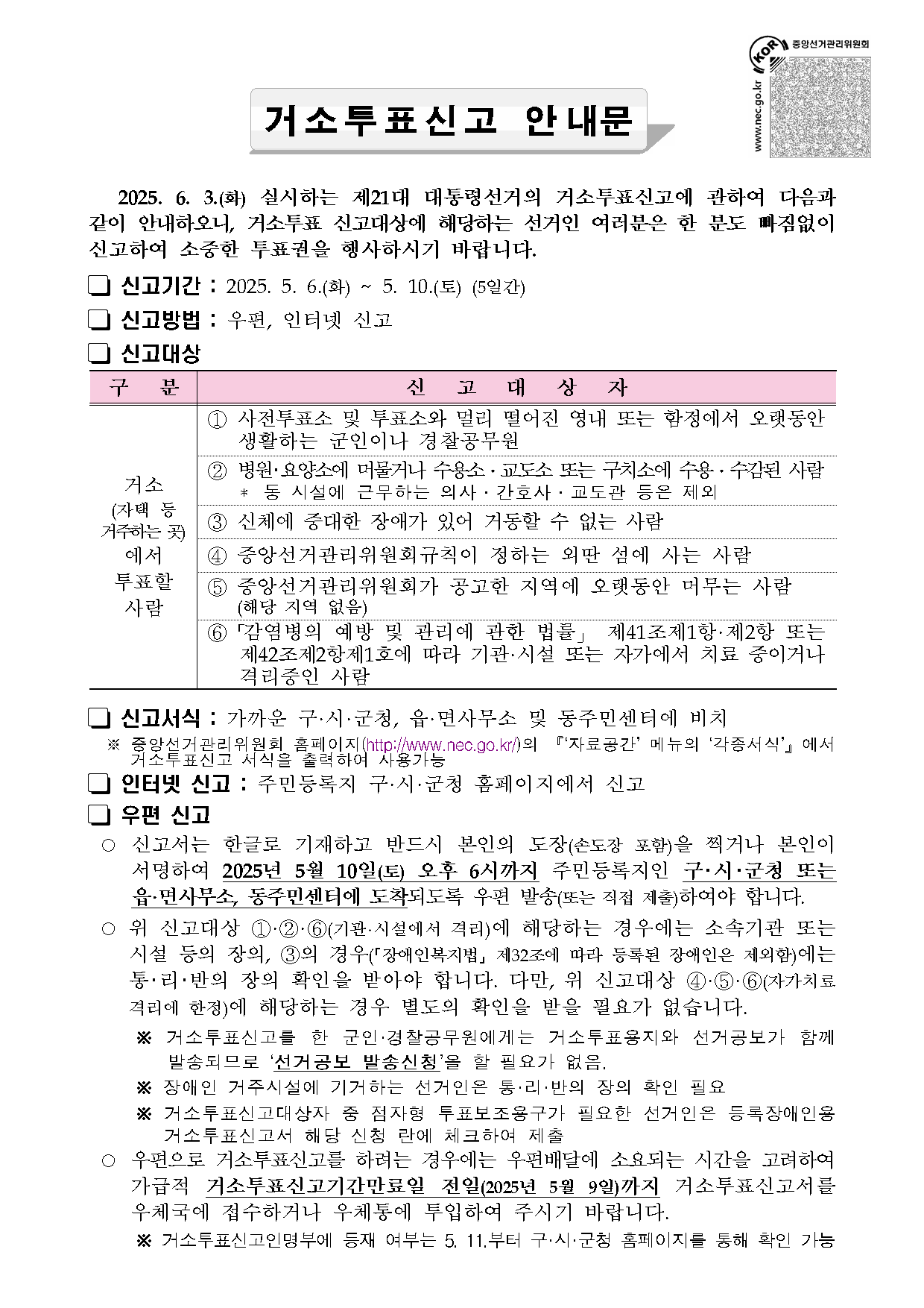 제21대 대통령선거 거소투표신고 등에 관한 안내