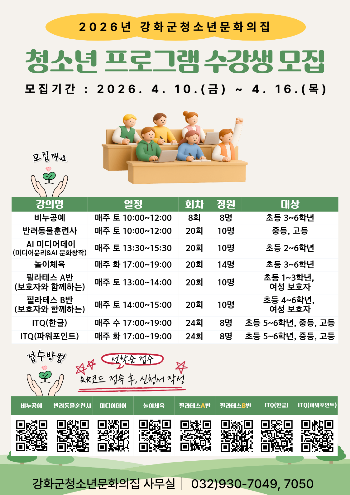 2026년 강화군청소년문화의집 청소년 프로그램 참여자 모집 홍보