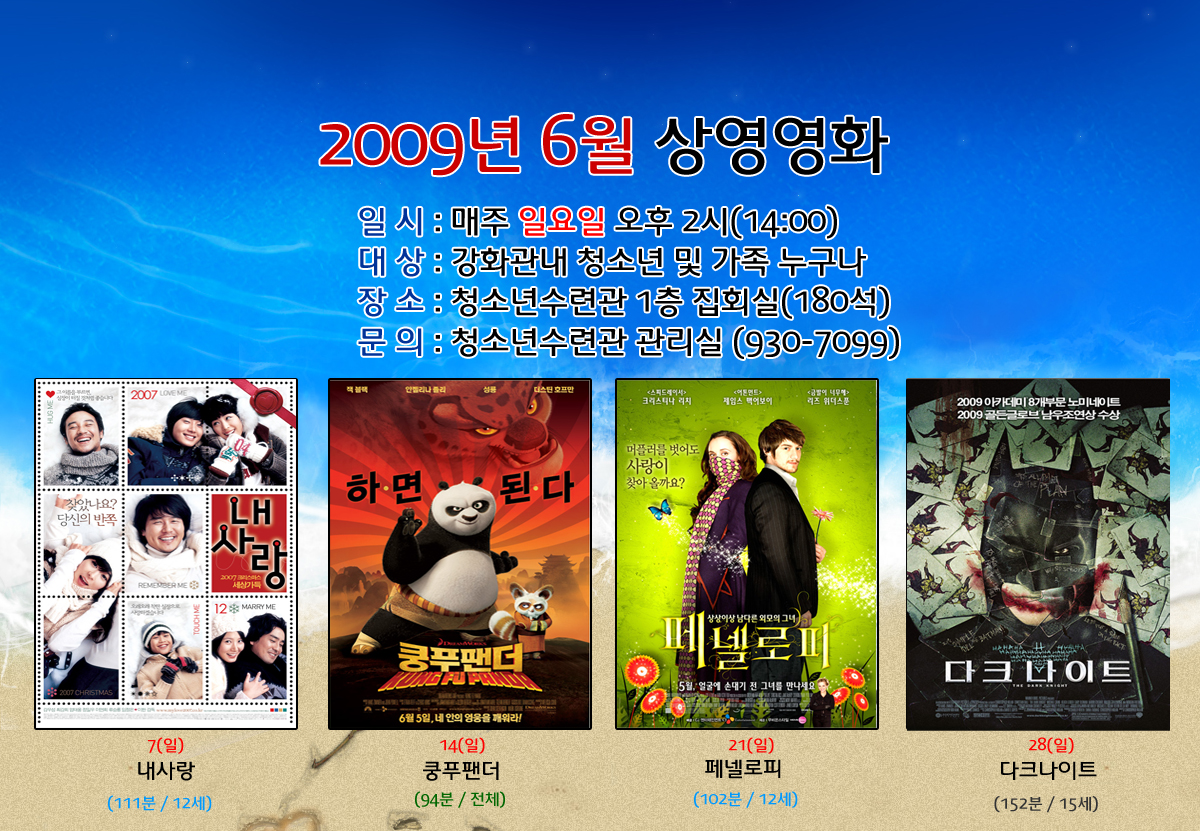 <BODY> <STRONG>2009년 6월 강화군청소년수련관에서 붙임과 같이 무료영화를 <BR><BR>상영하니 가족단위로 많이 관람하여 주시기 바랍니다.<BR><BR></STRONG><FONT color=#0000ff size=4><STRONG>ㅇ 일 시 : 매주 일요일 오후 2시<BR><BR>ㅇ 대 상 : 강화관내 청소년 및 누구나<BR><BR>ㅇ 장 소 : 청소년수련관 1층 집회실<BR><BR>ㅇ 문 의 : 청소년수련관 관리실 (☎ 930-7099)</STRONG></FONT> </BODY>