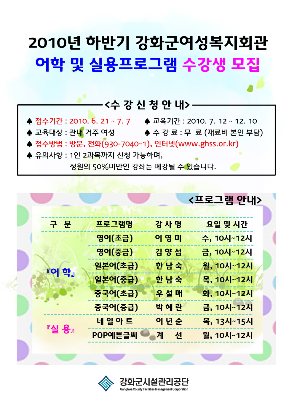 2010년 하반기 강화군여성복지회관 어학 및 실용 프로그램 수강생 모집