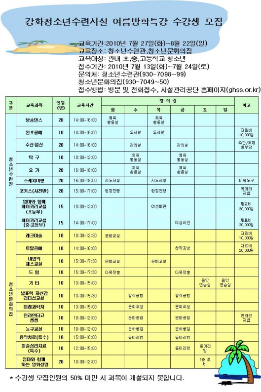 - 청소년수련관 (강화읍 용정리 소재) : 방송댄스 외 7과목