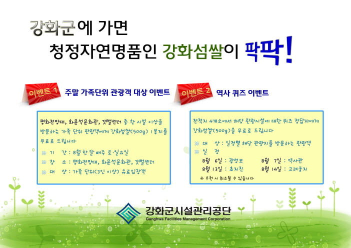 강화군시설관리공단에서는 여름방학 또는 휴가를 맞이하여 공단에서 관리 · 운영하고 있는 주요 관광지를 방문한 관광객을 대상으로 다양한 이벤트를 실시하오니 많은 분들의 관심과 참여 바랍니다.