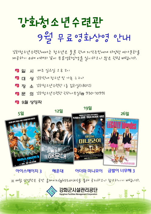 강화청소년수련관 9월 상영 안내(강화시설관리공단)