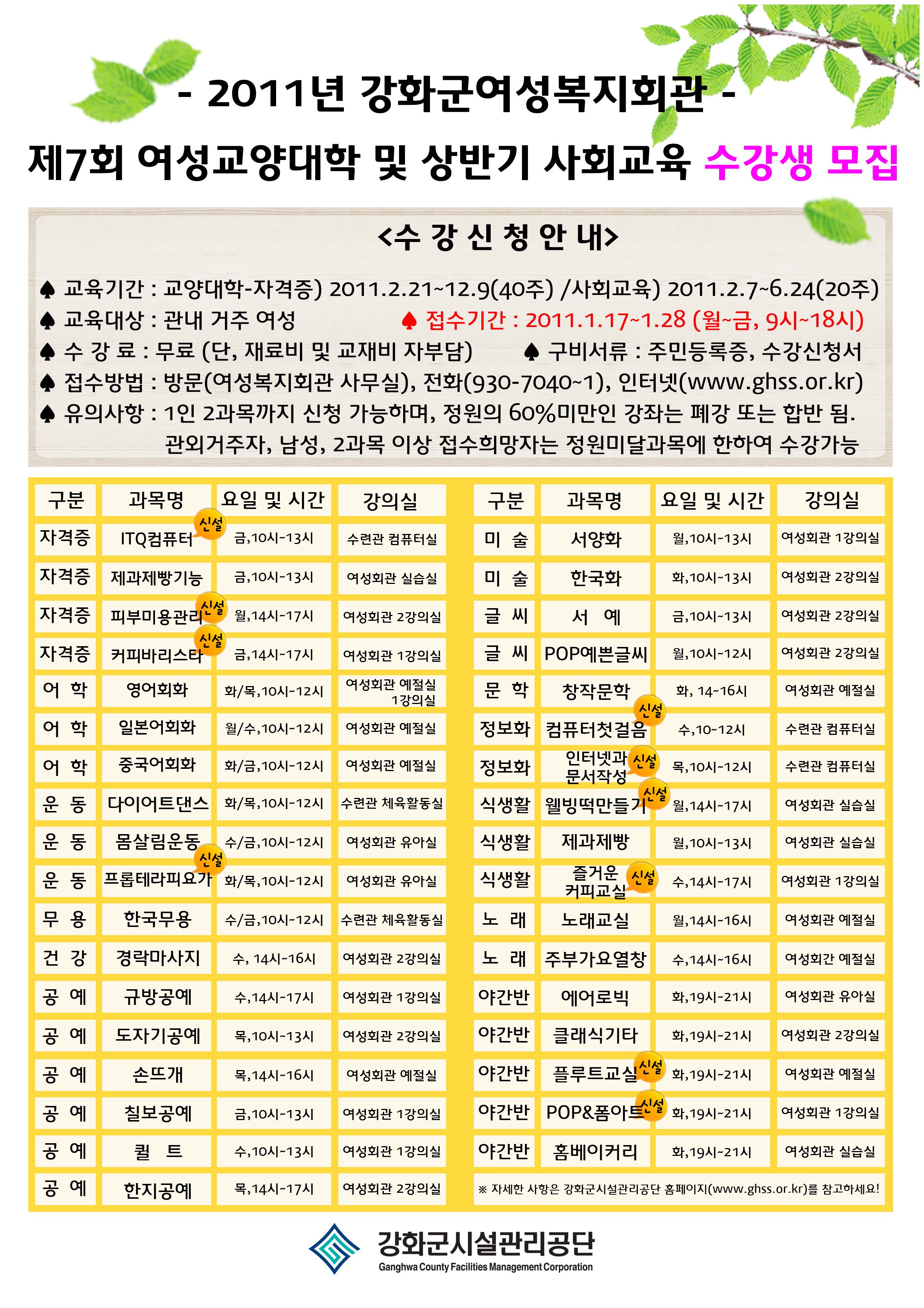 2011년 강화군여성복지회관 교육프로그램 수강생모집