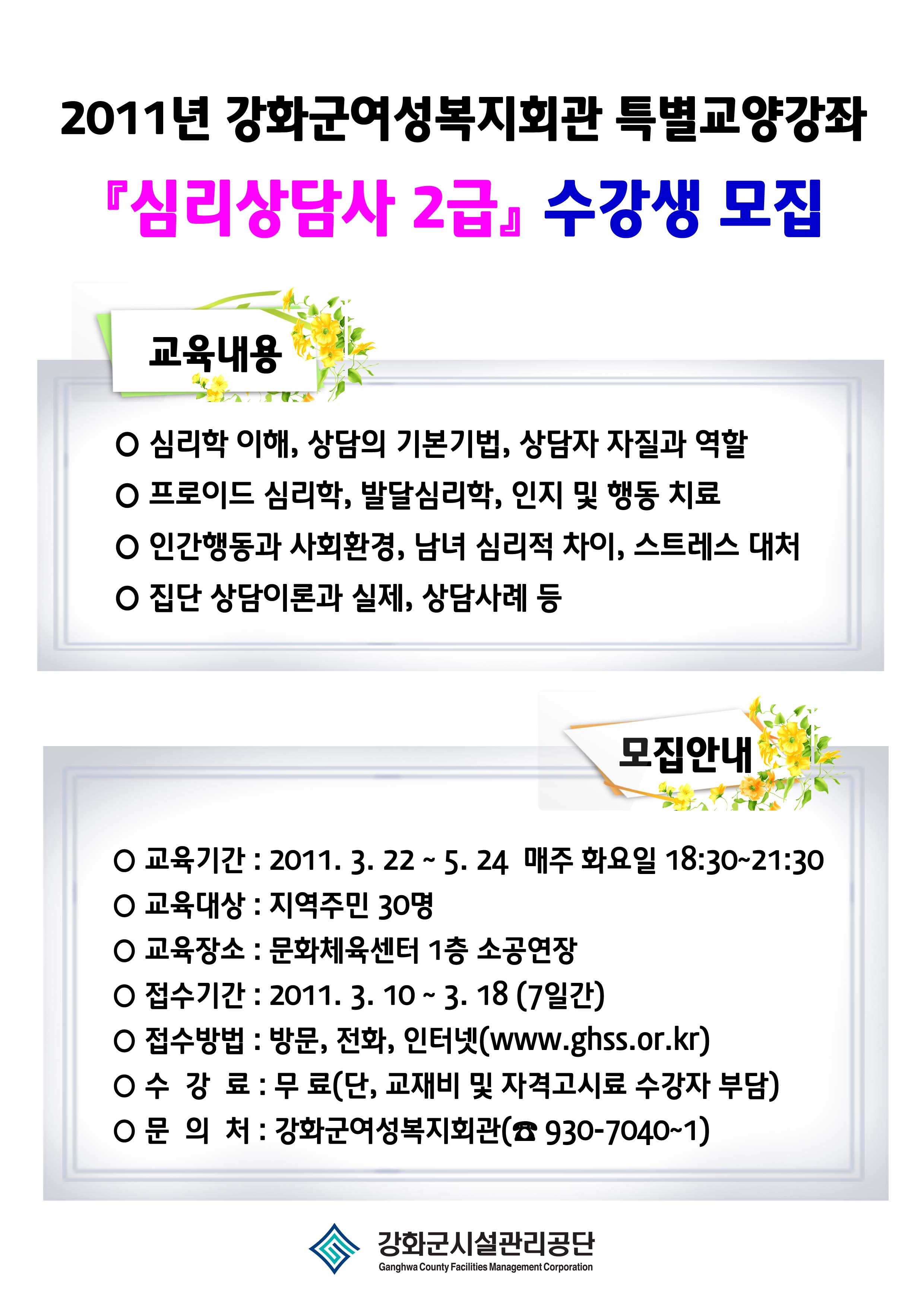 2011년 강화군여성복지회관 특별교양강좌(심리상담사 2급) 수강생 모집