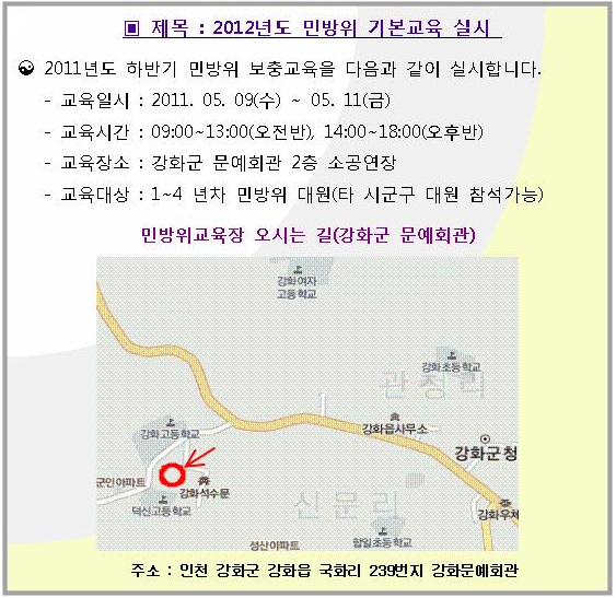 - 반드시 해당 읍, 면 민방위대 실시일에 참석할 필요는 없고 위 여섯개 반 중 한개반을 선택하여 참석 가능하며 민방위 교육훈련에 불참시 과태료 부과 등 불이익 처분이 행하여 질 수 있사오니 많은 참석 부탁드립니다.