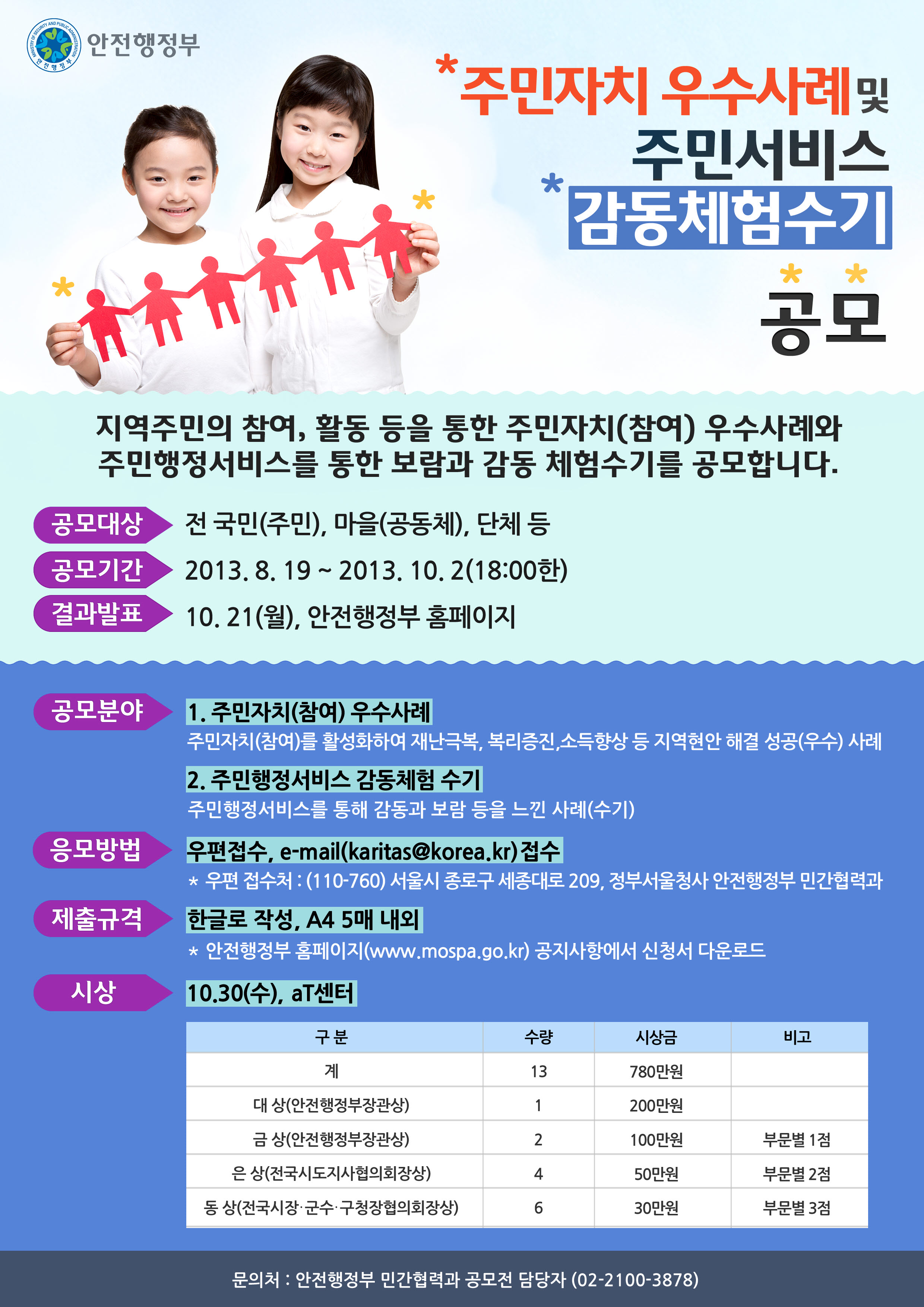 이에 안전행정부에서는 제1회 지방자치의 날 기념행사의 일환으로 지역주민의 자치 참여 서비스 체험을 통해 느낀 감동, 보람 등 우수사례를 발굴, 확신하기 위해 주민자치 우수사례 및 주민서비스 감동체험 수기 공모전을 붙임과 같이 추진 중이오니 아래 첨부를 참고하시어 관심있으신 분은 032-930-3238로 연락주시기 바랍니다. 여러분의 많은 참여 바랍니다.