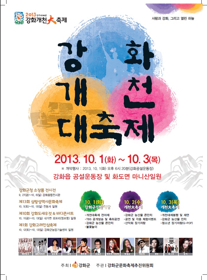 2013 강화개천大축제 개막식과 축하 공연이 아래와 같이 열릴 예정입니다. 군민여러분께서는 공설운동장으로 가족과 함께 참석하여 개막식과 축하공연을 관람하시기 바랍니다.