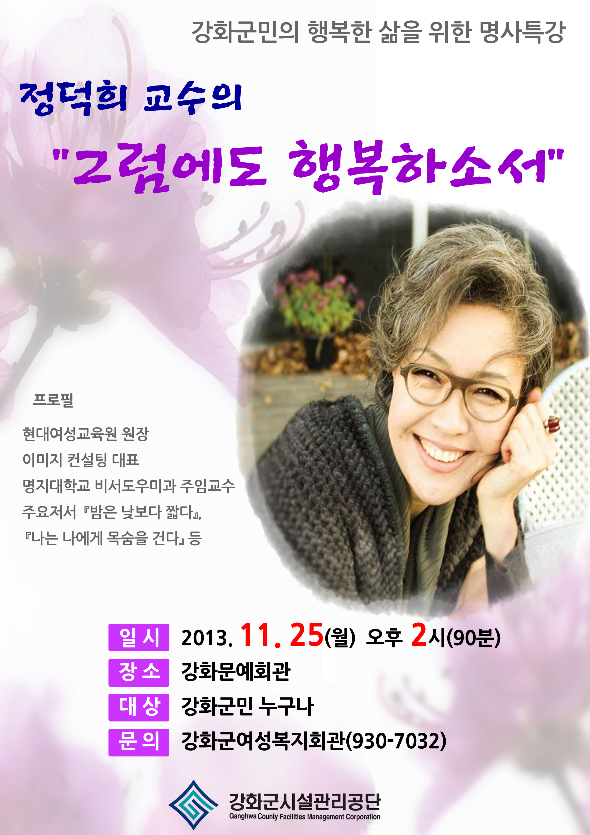 강화군민의 삶의 질 향상과 마음의 풍요를 위해 정덕희 교수를 초청하여 행복한 삶을 주제로 특별 강연을 개최하오니 군민 여러분의 많은 참여 바랍니다.