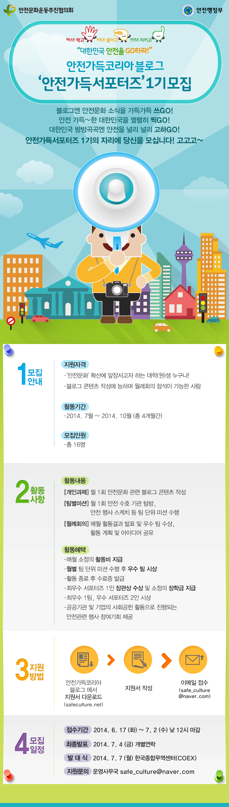 안전행정부에서 안전문화 관련 행사 취재, 안전문화 블로그 콘텐츠 작성 등 온·오프라인 활동을 통한 안전문화에 대한 국민적 공감대를 형성하고 대국민 인지도를 높이고자 대학생 서포터즈를 모집합니다.