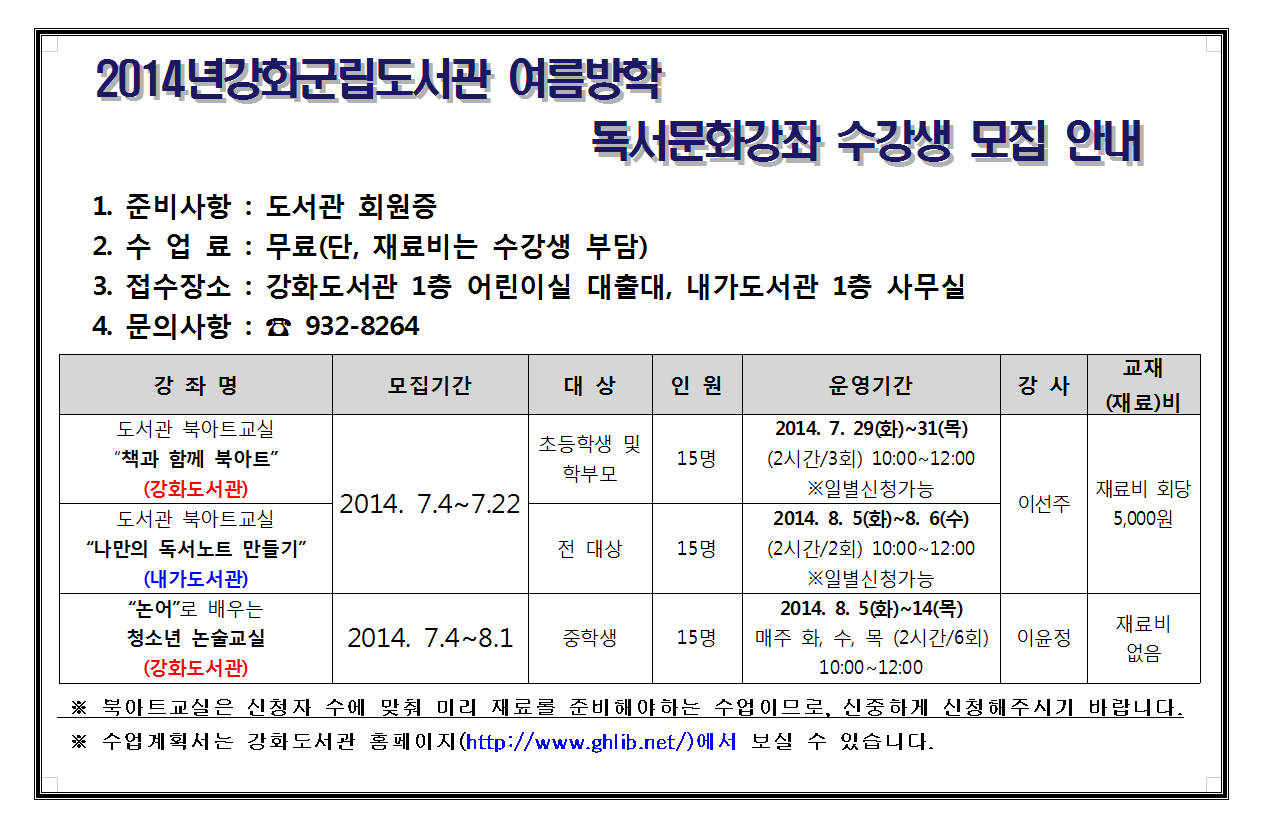 2014년 강화군립도서관 여름방학 독서문화강좌 수강생 모집