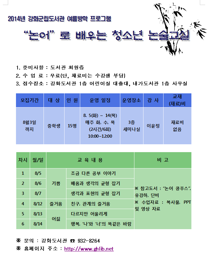 강화도서관 '논어'로 배우는 청소년 논술교실 안내