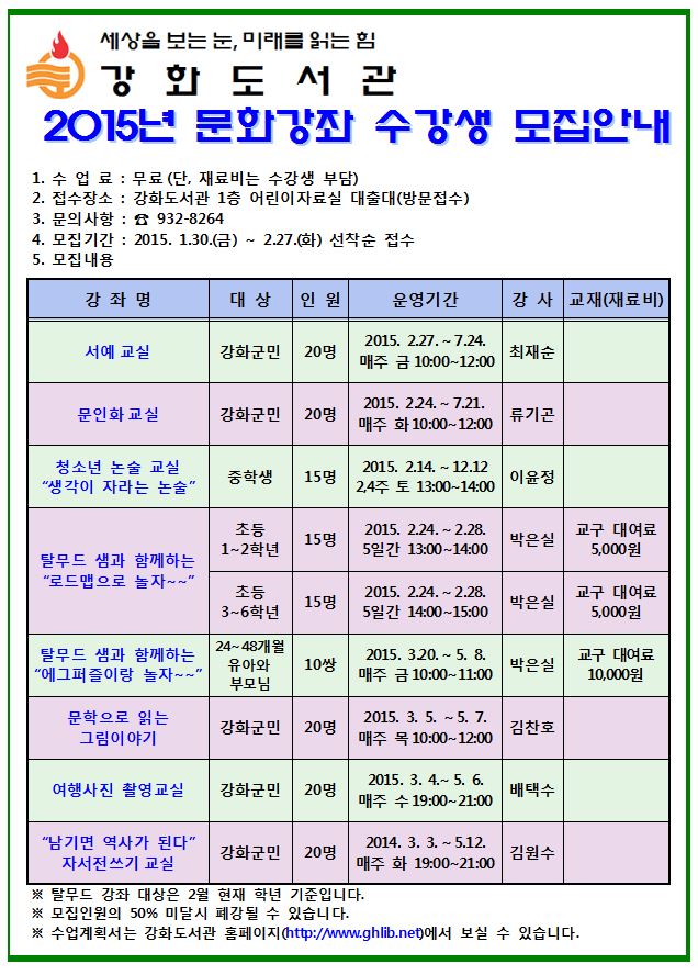 2015년 강화도서관 문화강좌 수강생 모집