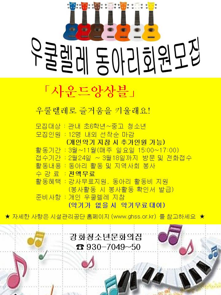 동아리 육성지원 프로그램『사운드앙상블』회원 및 청소년들의 정보공유와 소통을 위해 활동할 『청소년기자단』을 모집하오니 관내 학교 많은 청소년들이 참여하여 주시기 바랍니다.