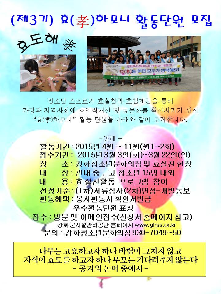 강화청소년문화의집에서는 지역사회 효인식 개선 및 효실천프로그램에 참여하여 활동할 제3기『효하모니』활동단원을 모집코자 하오니