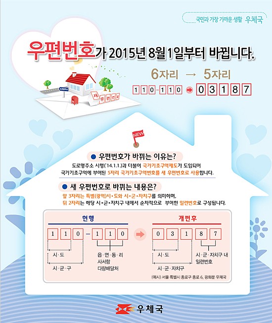 2015. 8. 1. 부터 우편번호가 5자리로 바뀝니다.