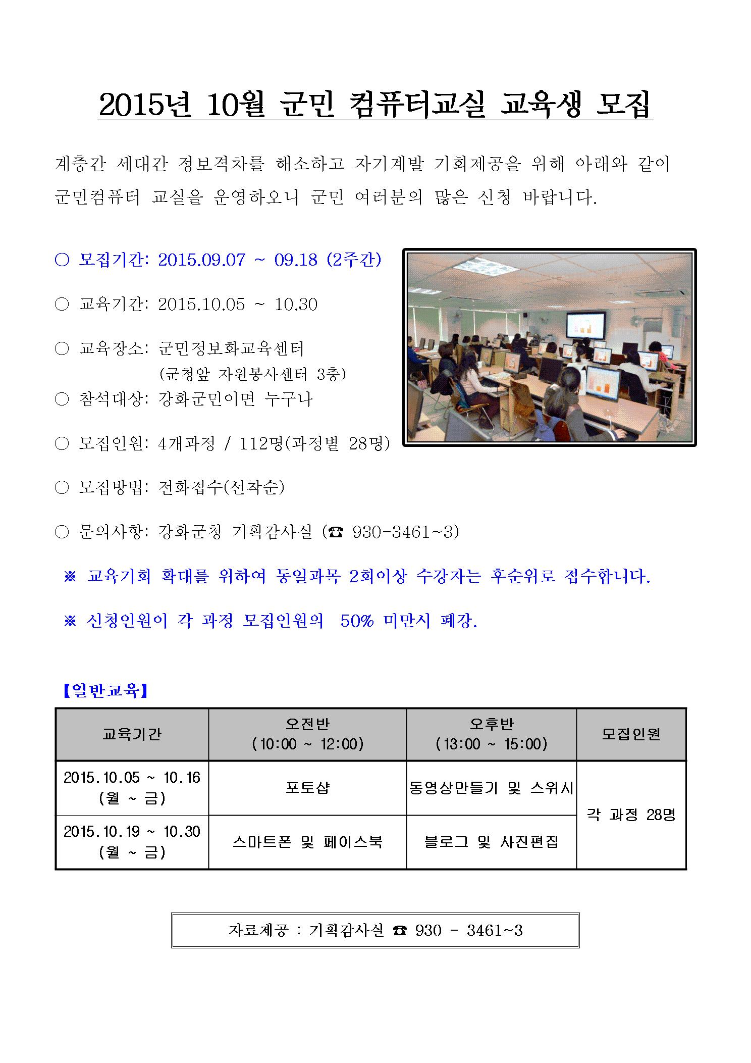2015년 10월 군민 컴퓨터교실 교육생 모집