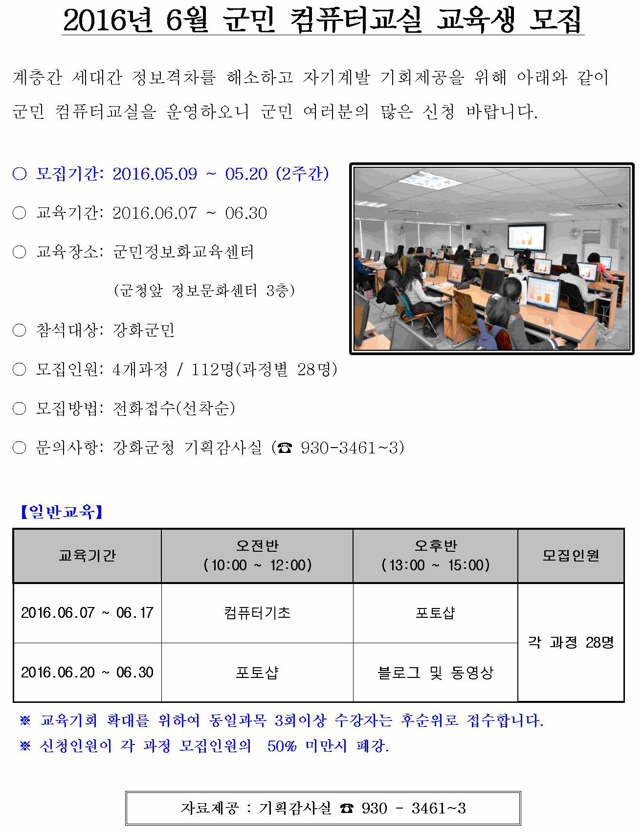 2016년 6월 군민컴퓨터교실 교육생 모집