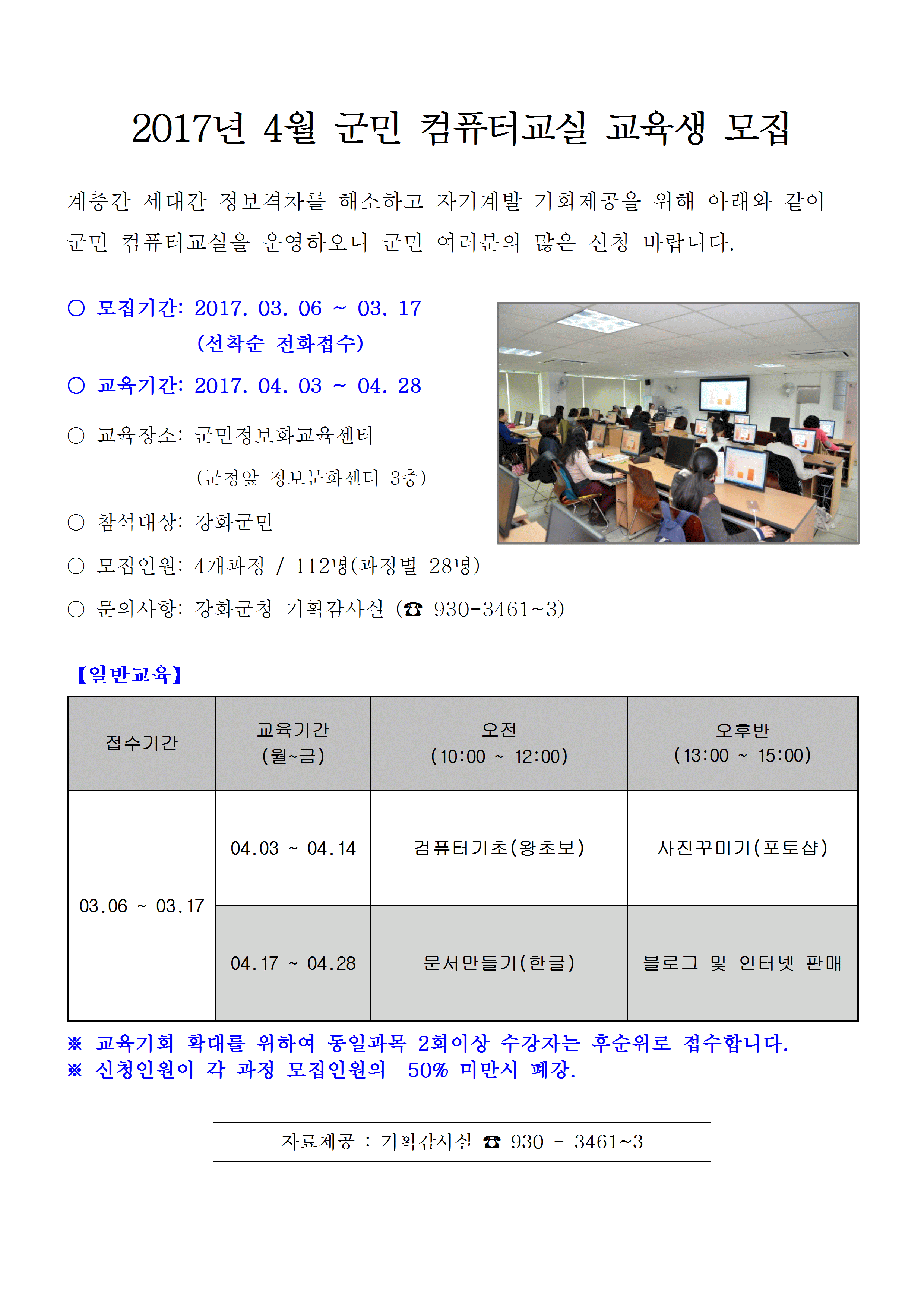 2017년 4월 군민 컴퓨터교실 교육생 모집