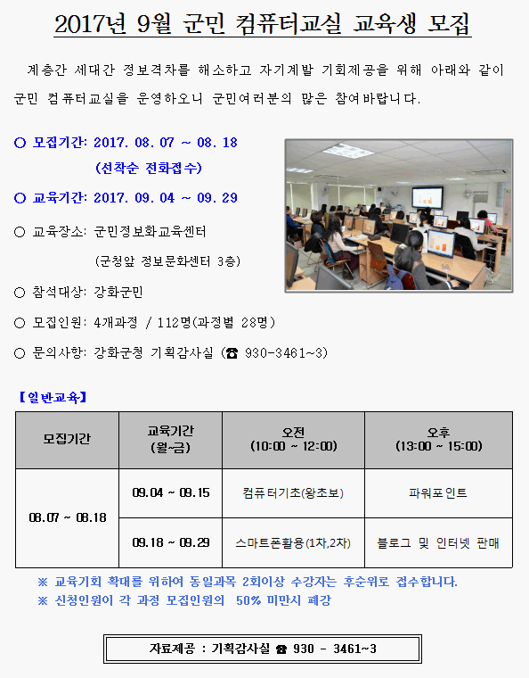 2017년 9월 군민 컴퓨터교실 교육생 모집