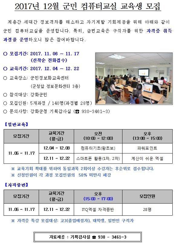2017년 12월 군민 컴퓨터교실 교육생 모집