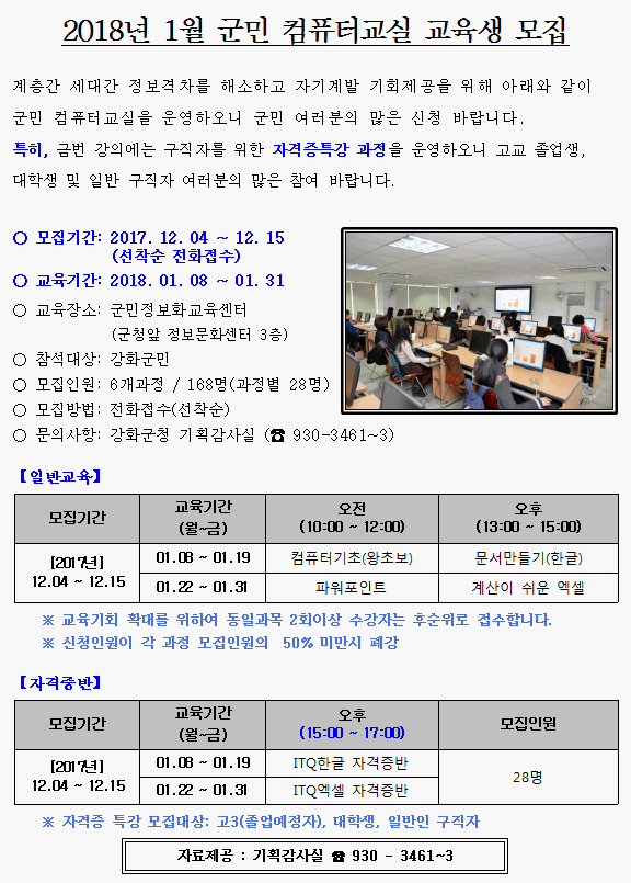 2018년 1월 군민 컴퓨터교실 교육생 모집