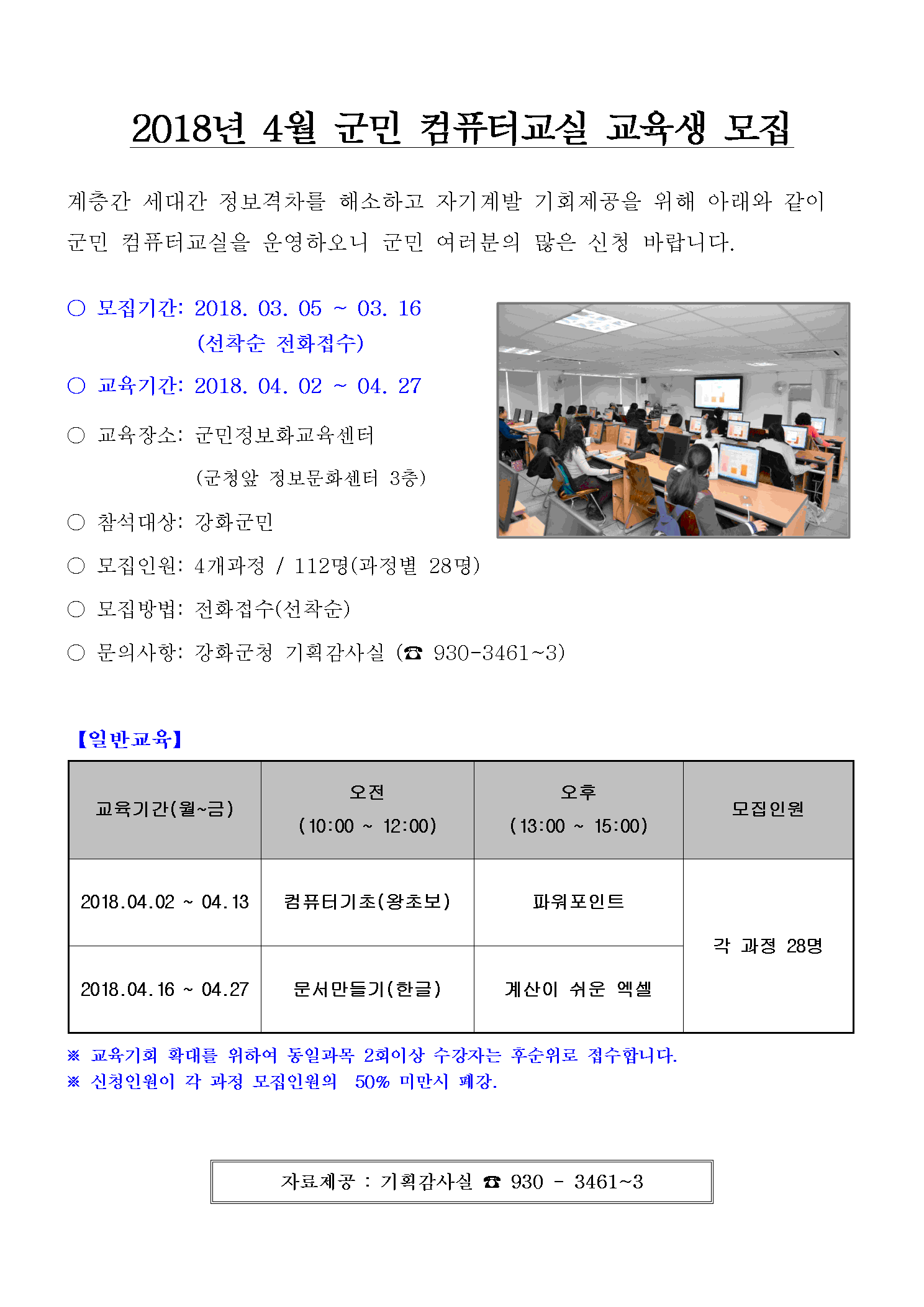 2018년 4월 군민 컴퓨터교실 교육생 모집